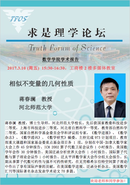 通知公告 通知公告 学术活动 2025 学术会议 新闻图片 院系新闻 院内邮件 华体会(中国) > 2017 [3.10][基础数学]蒋春澜教授题为《相似不变量的几何性质》的报告 来源:数学科学学院 发布时间:2017-03-06 1278