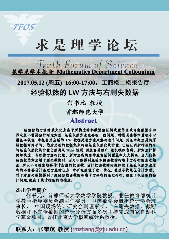 通知公告 通知公告 学术活动 2025 学术会议 新闻图片 院系新闻 院内邮件 华体会(中国) > 2017 [5/12][数理统计]何书元教授题为《经验似然的 LW 方法与右删失数据》的报告 来源:数学科学学院 发布时间:2017-04-30 856