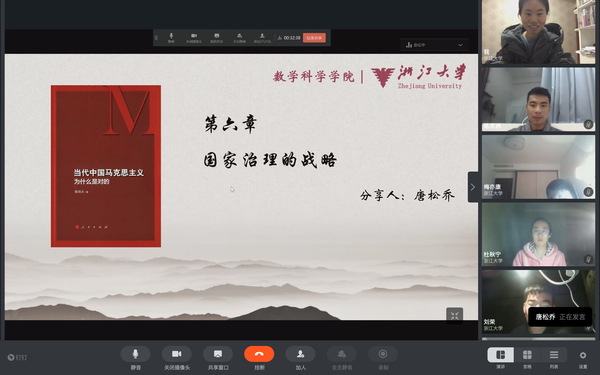 2020年3月24日晚上8点,数学科学学院“核心价值观进班级”讲师团第三次线上读书交流分享会如期召开。本期分享会由陈京洲和唐松乔两位同学主讲,他们分别对《当代中国马克思主义为什么是对的》一书的第五章和第六章做了内容梳理与心得体会的分享。