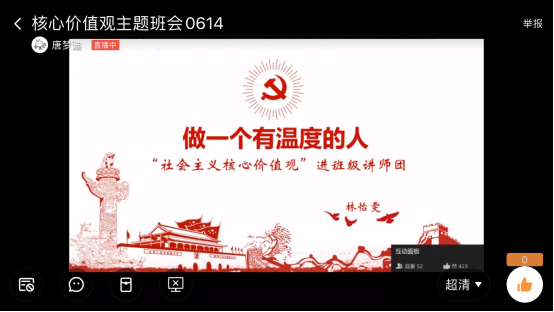 最后,林怡雯同学为大家带来一堂抗疫微党课,题为“做一个有温度的人”。 这次微党课聚焦抗“疫”阻击战中付出大爱与奉献精神、有温度的人们,展现千千万万个普通市民识大体、顾大局,以牺牲和贡献、坚持和努力共同抗击疫情的生动故事,展现了中国人民团结起来的巨大力量,展现了人类最大的温情和非凡的勇毅。