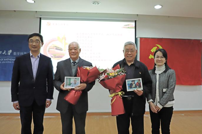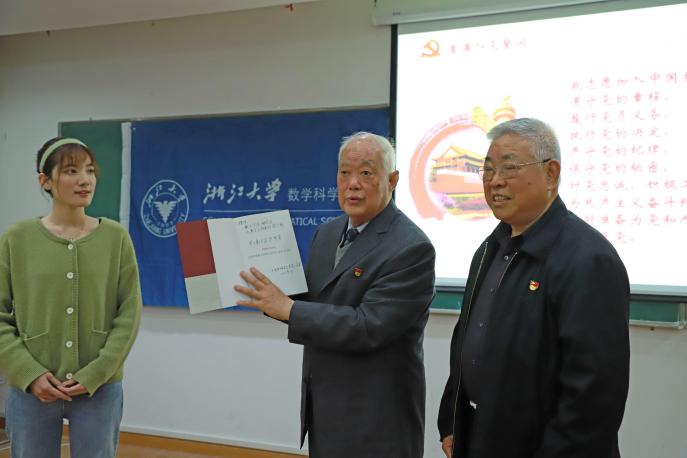 两位教授向学生支部党员赠送《纪念华罗庚<统筹方法平话>发表50周年》,勉励青年学子传承科学家精神,担负起历史赋予的责任使命。