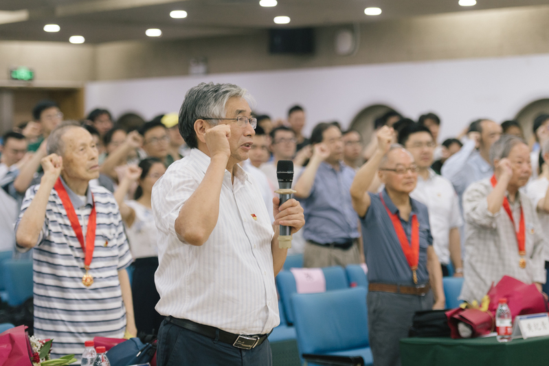 新发展党员代表在会上进行了集体宣誓,老党员们也重温了入党誓词,由原浙江大学数学系党总支书记、退休教工第二党支部书记孙林法领誓。声声誓言,激励新老党员坚定初心、继往开来。