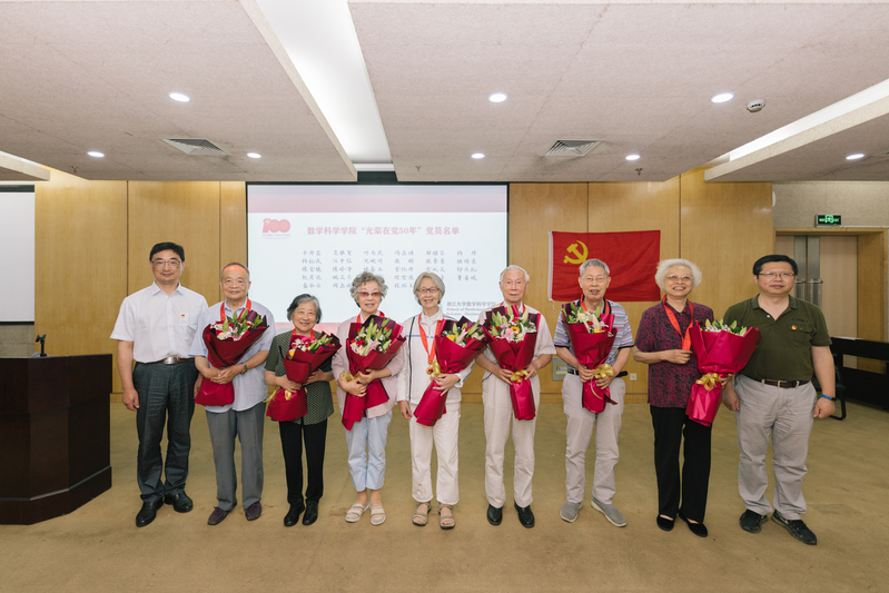 大会为数学科学学院老党员隆重颁发“光荣在党50年”纪念章。现场最为年长的老党员,今年已92岁高龄的黄纪青老师代表老党员发言。黄老师质朴而真诚的说,“我其实并没有为党做什么大事,但我今天真的很激动,感谢党没有忘记我们!”学院老党员们躬耕一线、挥洒汗水、奉献青春,在教书育人和学院发展中做出了卓越贡献。他们矢志报国的初心、为党育人的理想、踏实勤勉的奋斗将被时代铭记,新时代的浙大数学人也必将传承陈苏学派精神,发扬红色传统,赓续前辈基因,永担使命开新局,为国家建设和民族复兴贡献新的力量!