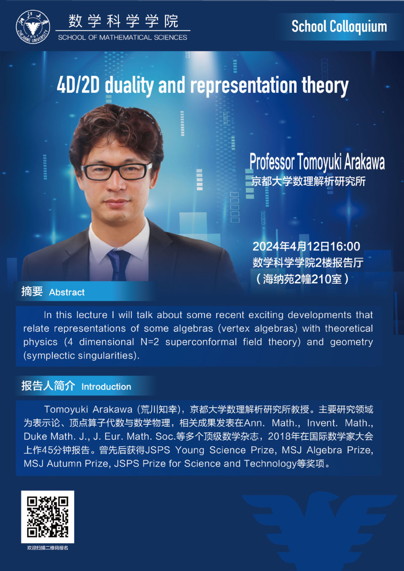 通知公告 通知公告 学术活动 2025 学术会议 新闻图片 院系新闻 院内邮件 华体会(中国) > 2024 School Colloquium——4D/2D duality and representation theory 来源:数学科学学院 发布时间:2024-04-07 358