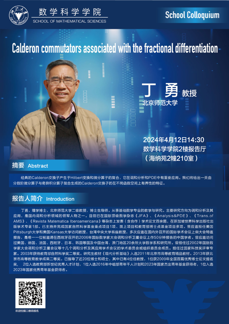 通知公告 通知公告 学术活动 2025 学术会议 新闻图片 院系新闻 院内邮件 华体会(中国) > 2024 School Colloquium——Calderon commutators associated with the fractional differentiation 来源:数学科学学院 发布时间:2024-04-07 400