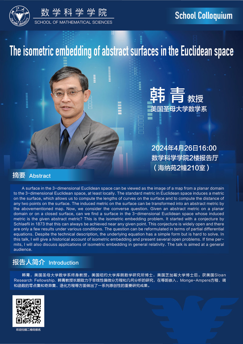 通知公告 通知公告 学术活动 2025 学术会议 新闻图片 院系新闻 院内邮件 华体会(中国) > 2024 School Colloquium——The isometric embedding of abstract surfaces in the Euclidean space 来源:数学科学学院 发布时间:2024-04-19 442