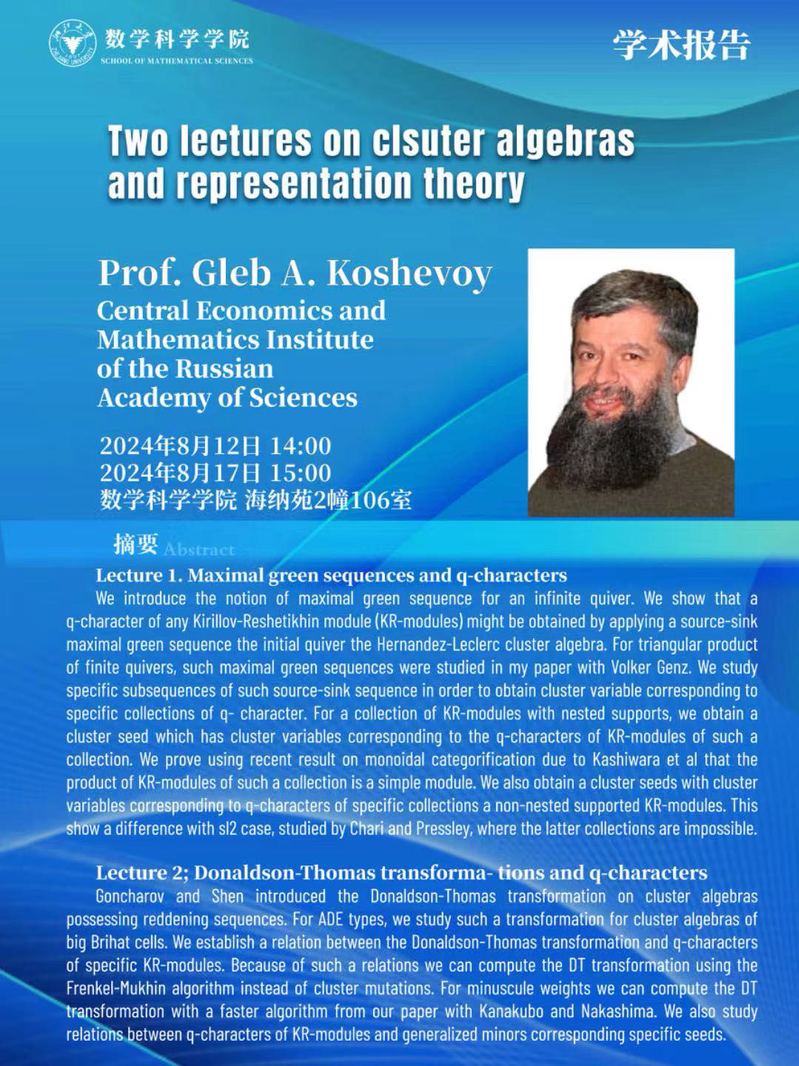 学术科研 学术团队 学术活动 学术会议 讨论班 School Colloquium 信息公告 文件汇编 华体会(中国) > 表示论与数论讨论班 代数与表示论讨论班——Two lectures on cluster algebras and representation theory 来源:数学科学学院 发布时间:2024-08-08 303